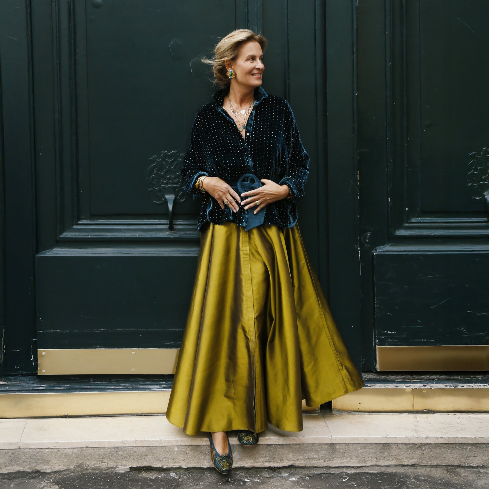Celebrate the season in the Gaby velvet shirt — deep emerald, delicately topstitched, and effortlessly refined. Paired with ballet flats and our made-to-measure taffeta skirt, available in the color of your choice. Contact us for more information.